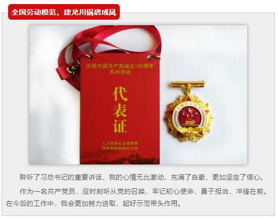全國人大代表建龍集團董事長、總裁張志祥全國勞動模范建龍川鍋唐成鳳受邀出席了此次慶祝大會