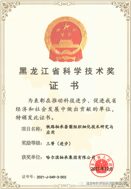 近日,黑龍江省科學(xué)技術(shù)獎(jiǎng)勵(lì)委員會(huì)公布了2021年度黑龍江省科學(xué)技術(shù)獎(jiǎng)結(jié)果,哈爾濱軸承集團(tuán)有限公司(以下簡(jiǎn)稱建龍哈軸)參與申報(bào)的“鐵路軸承套圈組織細(xì)化技術(shù)研究與應(yīng)用”項(xiàng)目,榮獲黑龍江省科技進(jìn)步三等獎(jiǎng)。