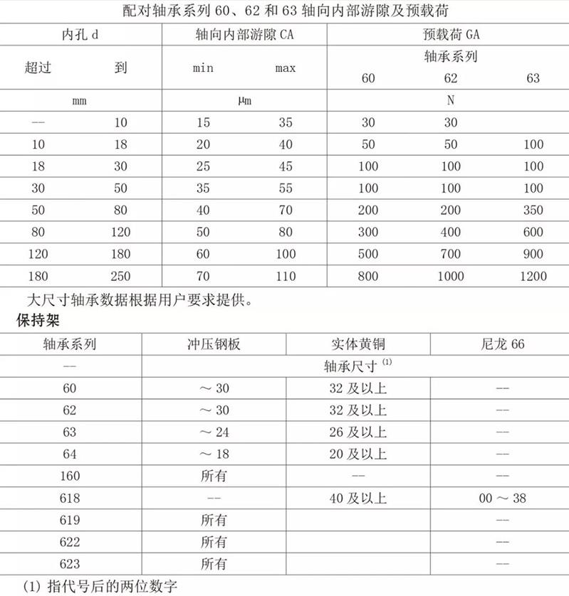 普通級深溝球軸承具有 C0組游隙,也可提供大于或小于普通級游隙的產(chǎn)品。雙列深溝球軸承具有普通級徑向游隙,背靠背或面對面組合軸承一般以下列兩種形式供貨較小的軸向游隙,后置代號 CA,輕型預(yù)壓,后置代號 GA,60、62 和 63 系列。